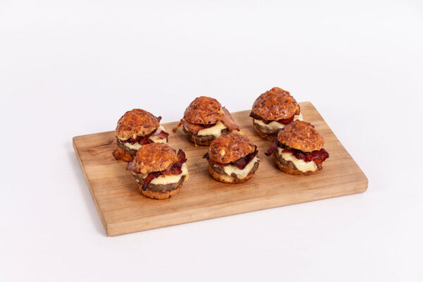 Hamburguesa HTQ, carne seleccionada (bife de chorizo y roast beef) pan brioche de parmesano con mayonesa, queso dambo, cebolla dorada y panceta crocante