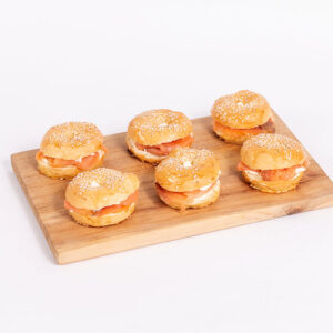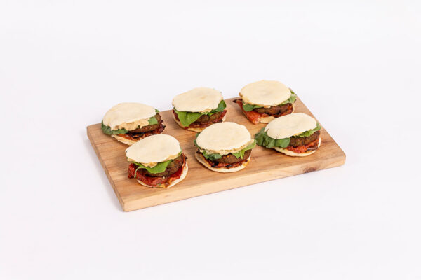 Mini pita con falafel, hummus, babaganoush, cebolla morada encurtida y pepino encurtido